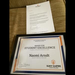 Continuing her commitment to personal growth, Naomi completed her MBA in 2023—remarkably, in under a year—after returning to Empire State University. Her resilience was recognized with the SUNY Chancellor Award and selection as student commencement speaker. Despite serious health challenges, including a rare inflammation disorder and complications causing mobility issues, Arndt has never let obstacles keep her from her goals.